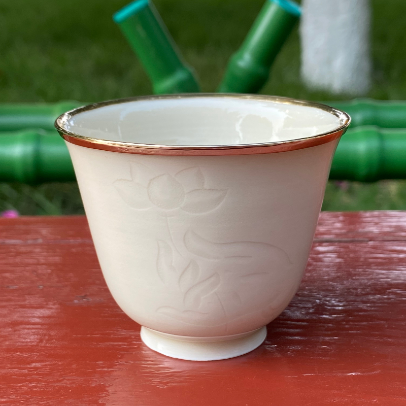 工藝:純手工拉坯、剔花、純金包口工藝,1320度高溫燒制。